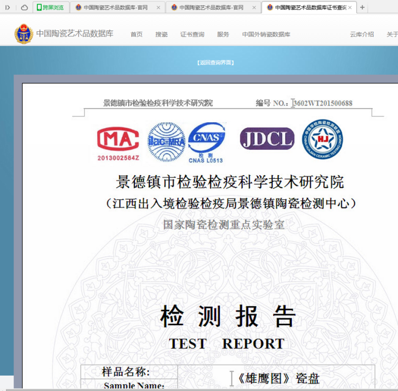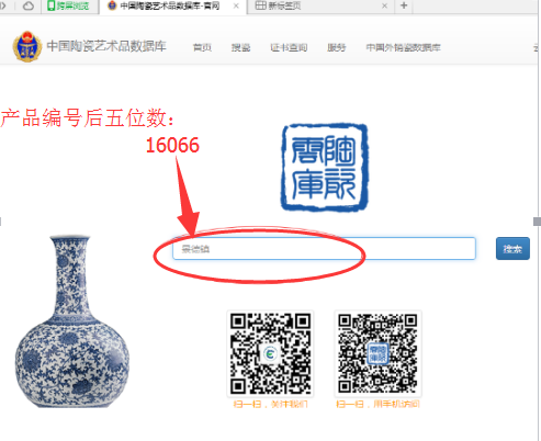 2、進入中國陶瓷藝術品數據庫官網頁面,在圖二的選中區域輸入圖一中產品編號后五位數字“16066”,即可檢索到該編號產品可供對外查詢信息(每個產品對外可查詢一個體視顯微鏡照片數據)