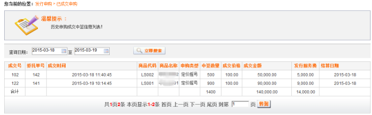 通過該頁面可以查詢到商品已申購成交的情況,包括對應商品中簽的數量、成交價格、申購類型、成交金額、發行服務費等信息。