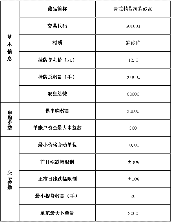 經景德鎮陶瓷交易所有限公司(以下稱本交易所)發行會員申請,本交易所專家委員會、新藏品掛牌審核小組評估審核通過,對已經完成托管入庫的藏品《青龍精紫拼紫砂泥》準予在本交易所線上實物交易系統正式掛牌交易,具體事項公告如下: