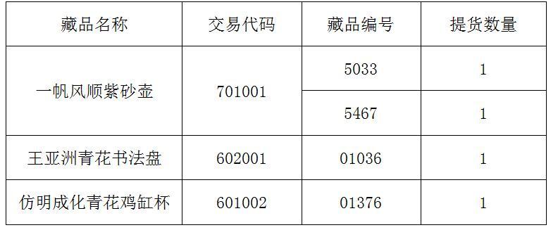 應投資人會員申請,經本交易所對申請人信息核實以及出庫藏品復驗后,提貨藏品已完成發貨,提醒廣大投資者注意盤面藏品數量變化。提貨藏品信息如下: